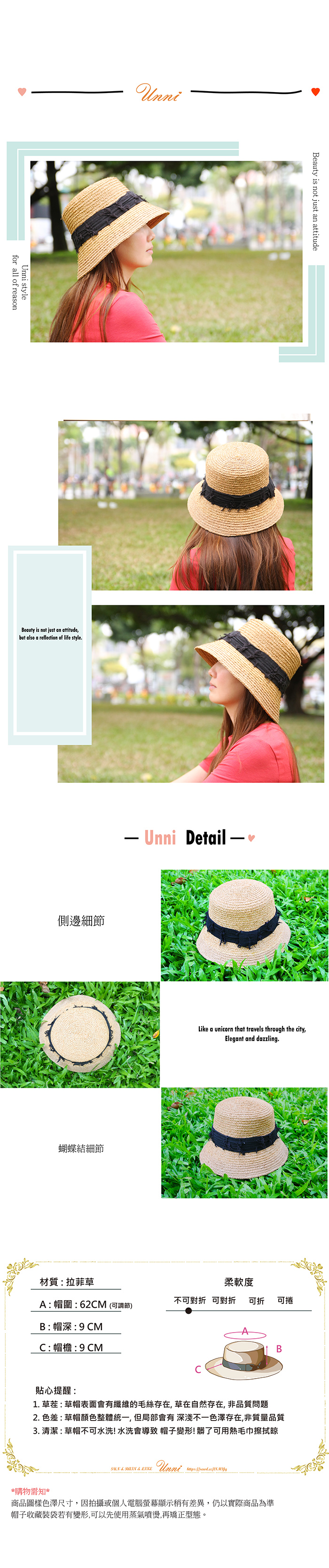 Unni拉菲草帽: 韌度,透氣,遮曬,質地光滑不粗糙,可折疊,手工編製,方便隨身攜帶