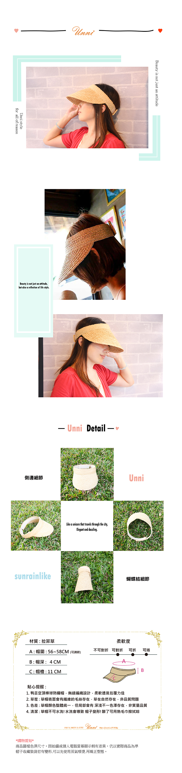 Unni拉菲草帽: 韌度,透氣,遮曬,質地不粗糙,可折疊,手工編製,方便攜帶