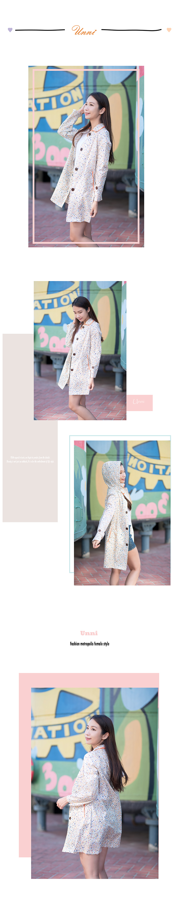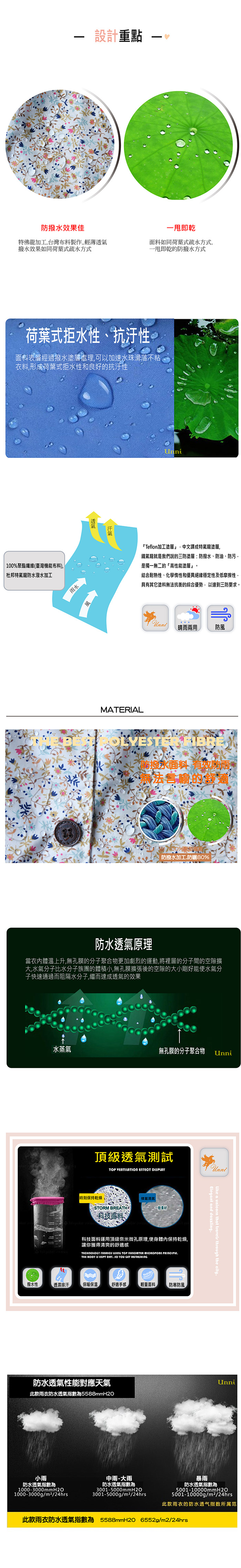 1. 高檔時尚機能風衣,雨水一甩即乾,出門旅行既可以當風衣穿,又可當雨衣穿。2. 材質:特氟龍塗層加工pongee(台灣機能布料),表層防潑水處理,具有荷葉式疏水效果,防撥水,又透氣,完全擺脫傳統雨衣3. 具有良好的柔軟性、擋風性和強度好,無毒環保、採用最先進的機械印花工藝,不存在色油、掉色、色牢度不好等問題 by Sun.Rain.Like