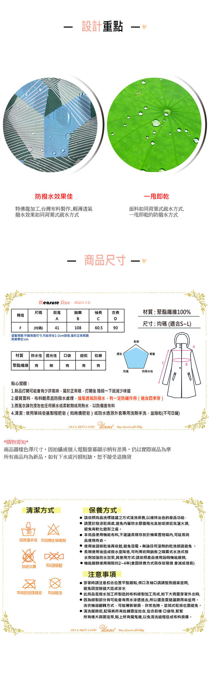 1. 高檔時尚機能風衣,雨水一甩即乾,出門旅行既可以當風衣穿,又可當雨衣穿。2. 材質:特氟龍塗層加工pongee(台灣機能布料),表層防潑水處理,具有荷葉式疏水效果,防撥水,又透氣,完全擺脫傳統雨衣3. 具有良好的柔軟性、擋風性和強度好,無毒環保、採用最先進的機械印花工藝,不存在色油、掉色、色牢度不好等問題 by Sun.Rain.Like