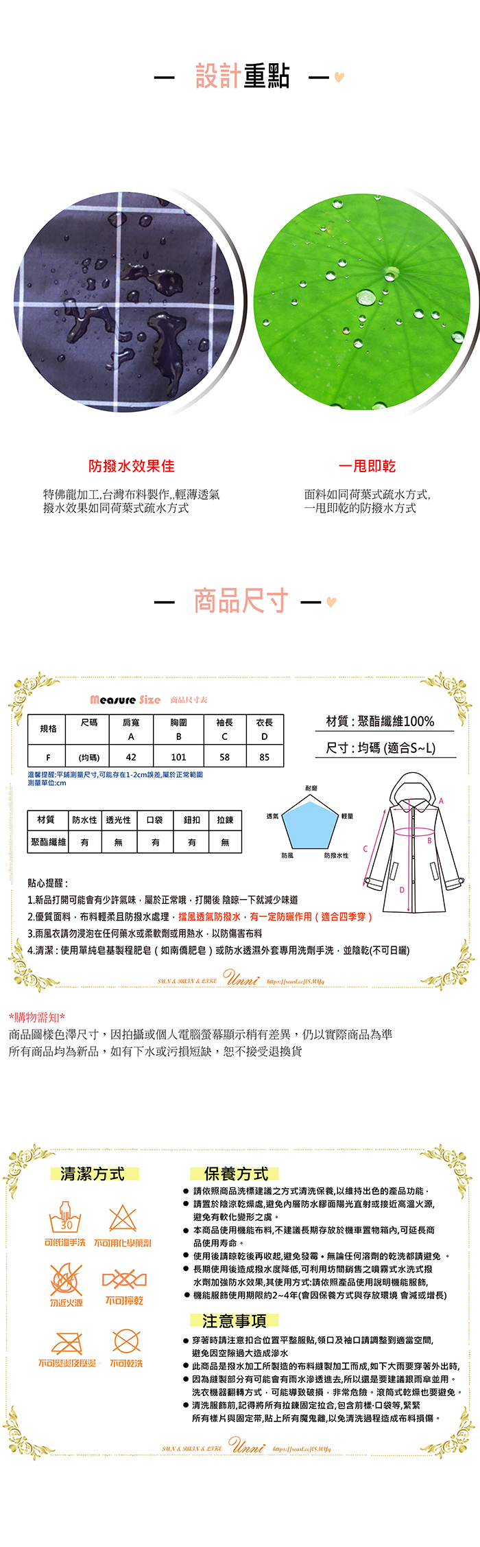 1. 高檔時尚機能風衣,雨水一甩即乾,出門旅行既可以當風衣穿,又可當雨衣穿。2. 材質:特氟龍塗層加工pongee(台灣機能布料),表層防潑水處理,具有荷葉式疏水效果,防撥水,又透氣,完全擺脫傳統雨衣3. 具有良好的柔軟性、擋風性和強度好,無毒環保、採用最先進的機械印花工藝,不存在色油、掉色、色牢度不好等問題 by Sun.Rain.Like