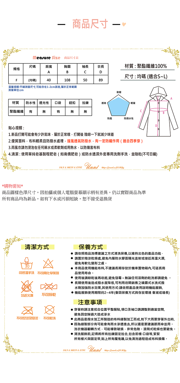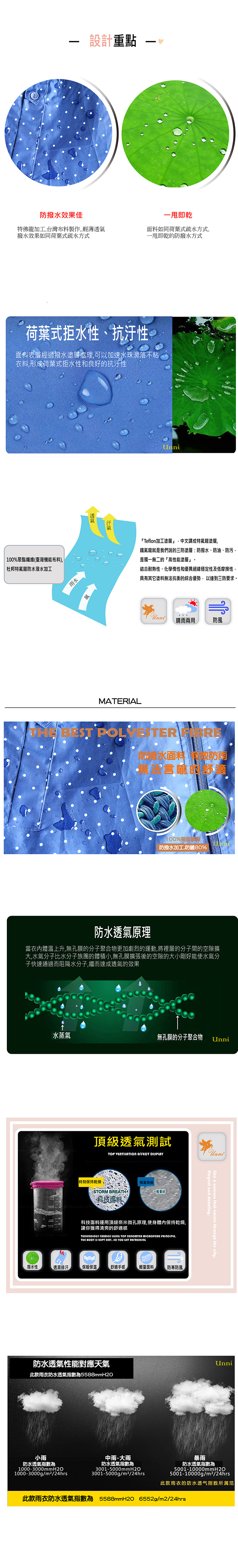 1. 高檔時尚機能風衣,雨水一甩即乾,出門旅行既可以當風衣穿,又可當雨衣穿。2. 材質:特氟龍塗層加工pongee(台灣機能布料),表層防潑水處理,具有荷葉式疏水效果,防撥水,又透氣,完全擺脫傳統雨衣3. 具有良好的柔軟性、擋風性和強度好,無毒環保、採用最先進的機械印花工藝,不存在色油、掉色、色牢度不好等問題 by Sun.Rain.Like