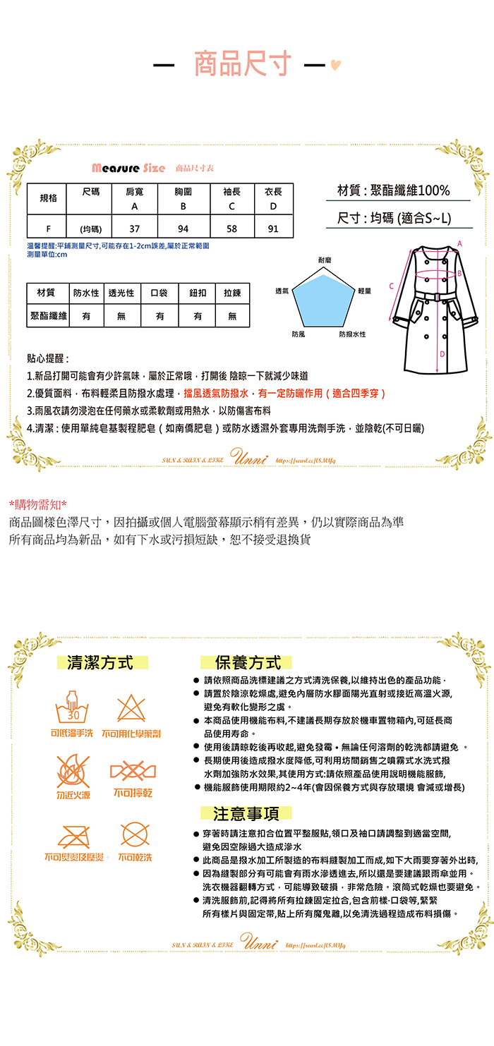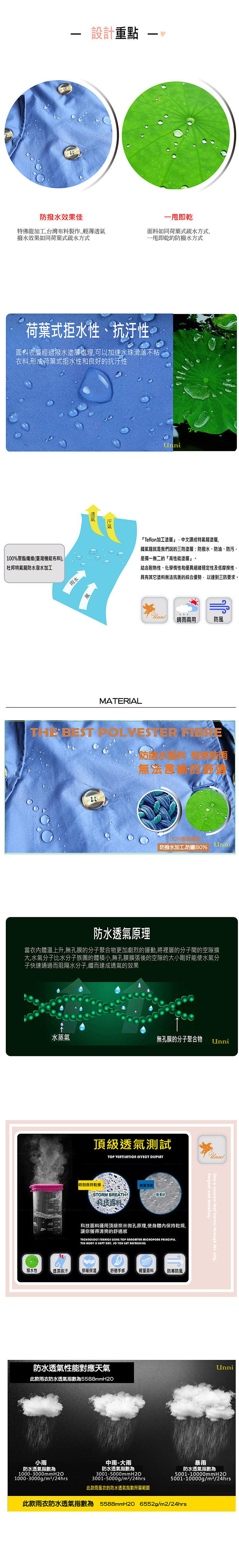 1. 高檔時尚機能風衣,雨水一甩即乾,出門旅行既可以當風衣穿,又可當雨衣穿。2. 材質:特氟龍塗層加工pongee(台灣機能布料),表層防潑水處理,具有荷葉式疏水效果,防撥水,又透氣,完全擺脫傳統雨衣3. 具有良好的柔軟性、擋風性和強度好,無毒環保、採用最先進的機械印花工藝,不存在色油、掉色、色牢度不好等問題 by Sun.Rain.Like